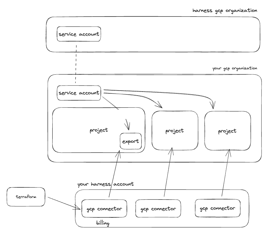 Enabling CCM for your project that holds the billing export gets your cost data into Harness and enables you to start creating perspectives, budgets, alerts, and dashboards. To leverage the other features like inventory and auto stopping we need to give access and create connectors for each project where you want to use these other features.