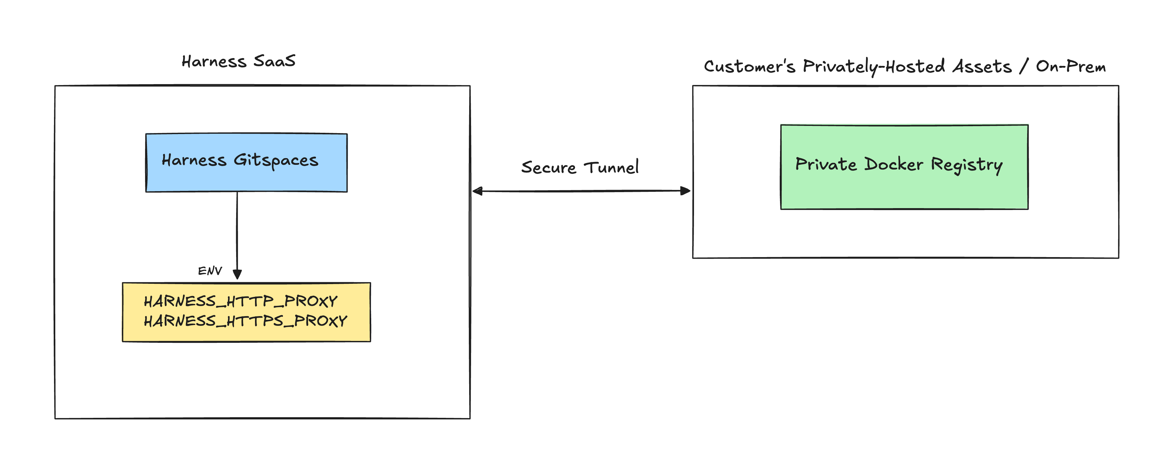 Harness Gitspaces offers the Secure Connect feature, providing a robust and secure proxy solution. This feature allows seamless integration with your on-premises, privately-hosted assets such as Docker Registries and Artifact Repositories. Additionally, you can customize your configurations using proxy environment variables for enhanced flexibility.