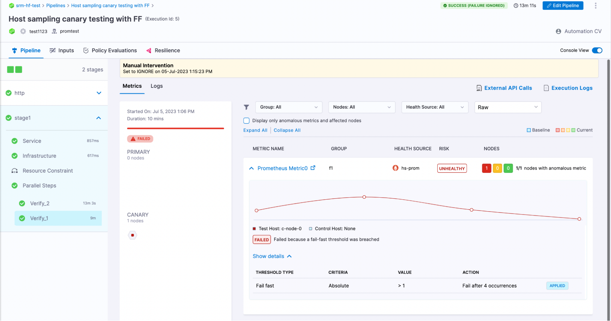 To ensure the canary pod is performing correctly, Absolute Fail-Fast thresholds can be configured for that metric, which will fail the verification if the threshold is breached, even in the absence of data from primary nodes.