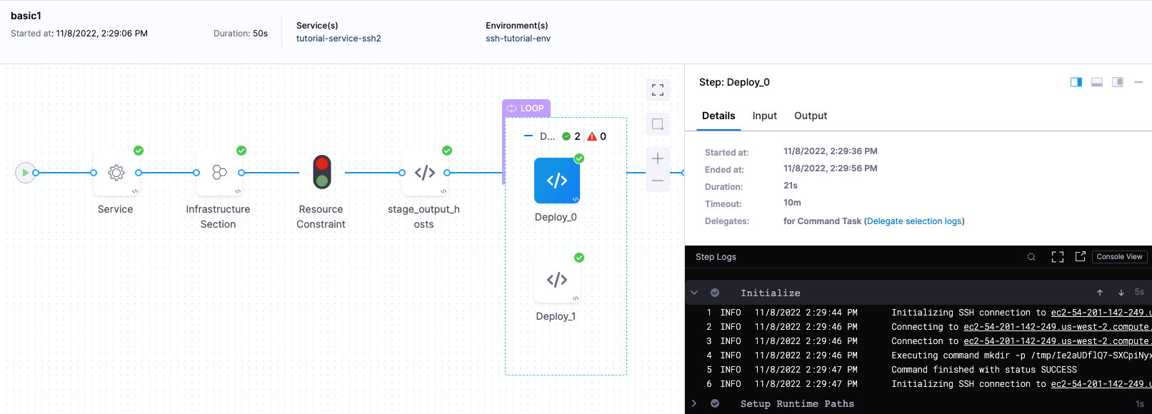 You can also add a Shell Script step to echo <+stage.output.hosts> to see the target hosts. The expression will resolve to a list like this SSH example that deploys to AWS EC2 instances: