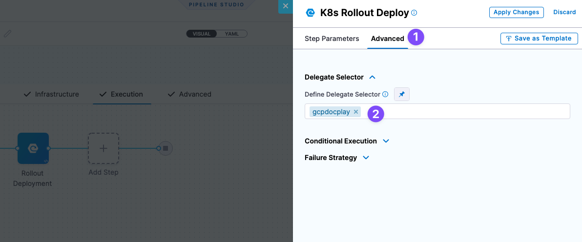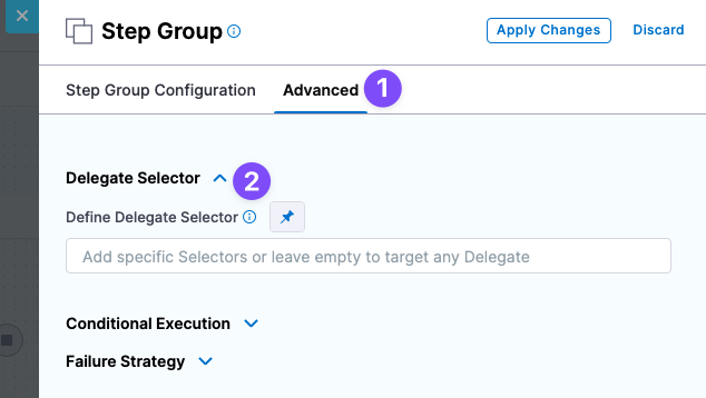 However, it is also possible to set a delegate at the step level using the Delegate Selectors advanced option. Choosing a selector in this method described above will override any previously selected delegate selector, including selections from the pipeline, stage, step group or infrastructure definition (via connector). This can lead to unexpected behavior.
