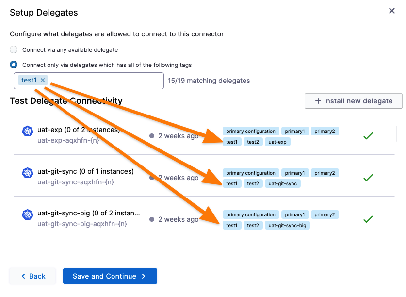 You can select a delegate based on its tags in the Delegate Selector settings of Harness entities like pipelines and connectors.