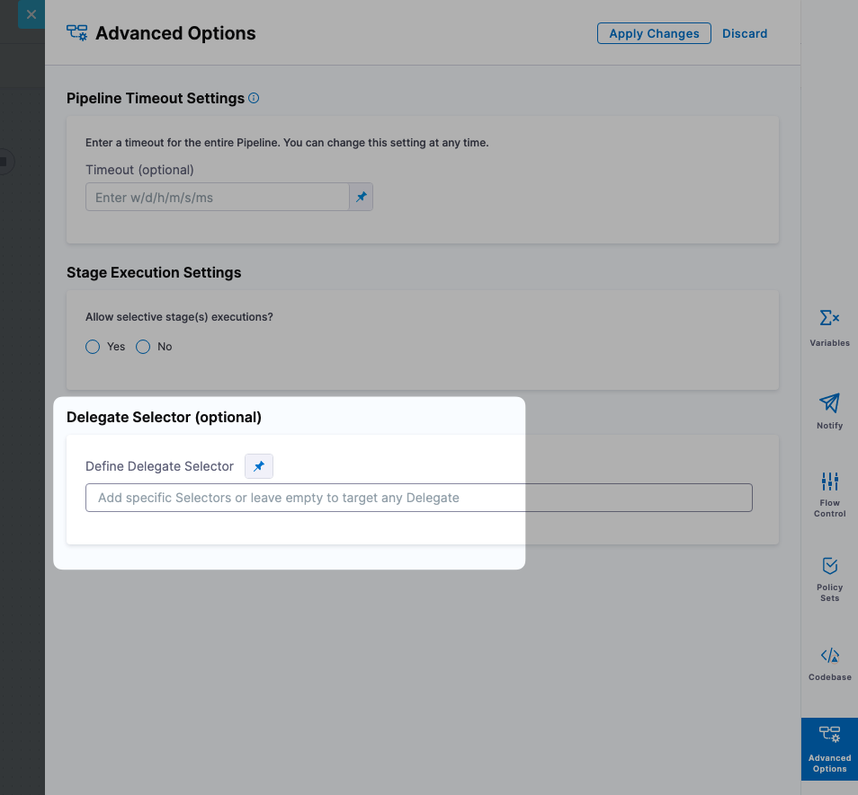Delegate selectors are a powerful tool, but should be used carefully and only when necessary. A good use case for using this advanced setting is to target delegates that have access to a third party systems that you may not want your deployment specific delegates to use.