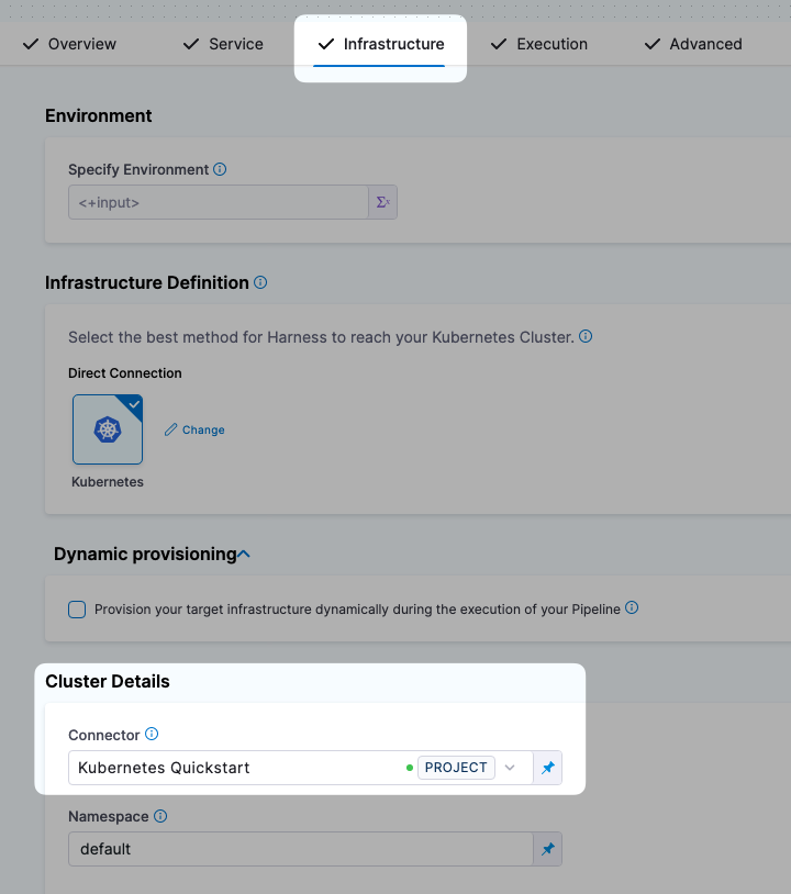 A connector can be used in multiple places in a pipeline, such as a stage infrastructure's Cloud Provider setting or even in certain step settings.
