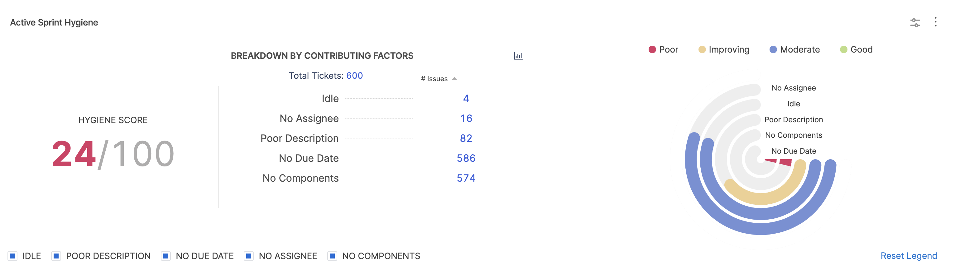 You can use this report to measure and track the hygiene score for the previous sprint or the active sprints.